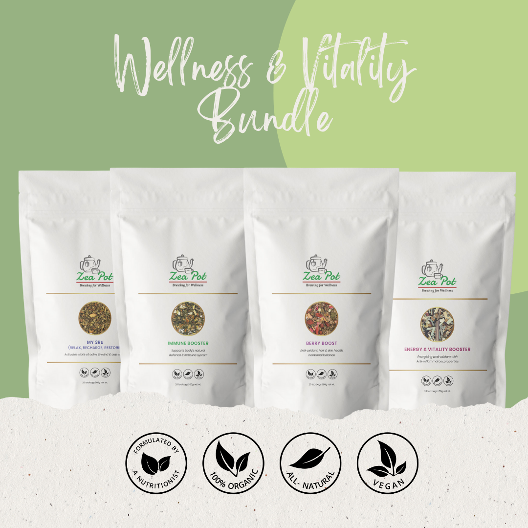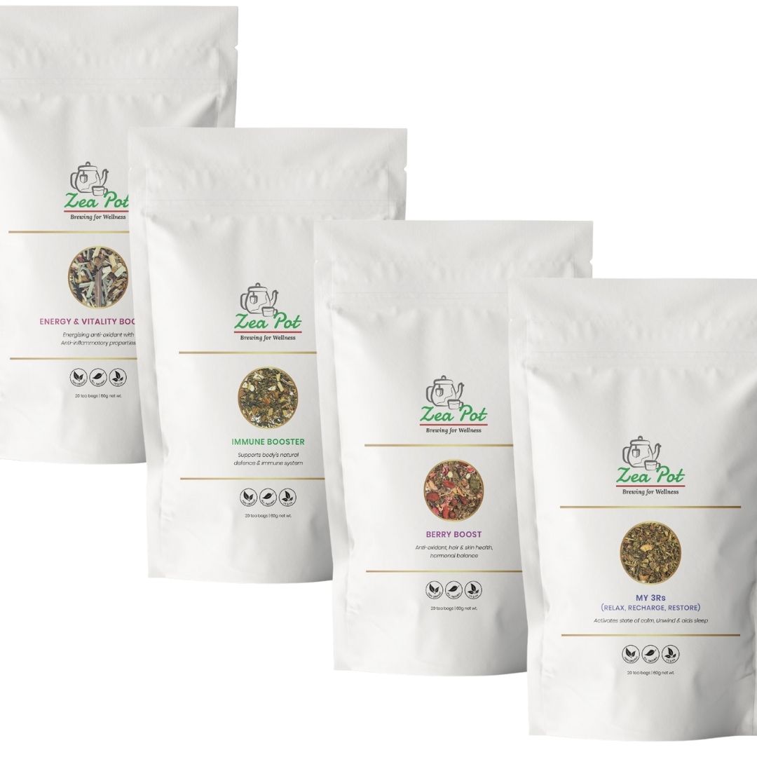 This bundle is your daily wellness partner—crafted for busy hearts and demanding schedules. Each blend plays a unique role: calming your spirit, energizing your day, safeguarding your health, and lifting your glow. Together, they’re your holistic reset in a cup.